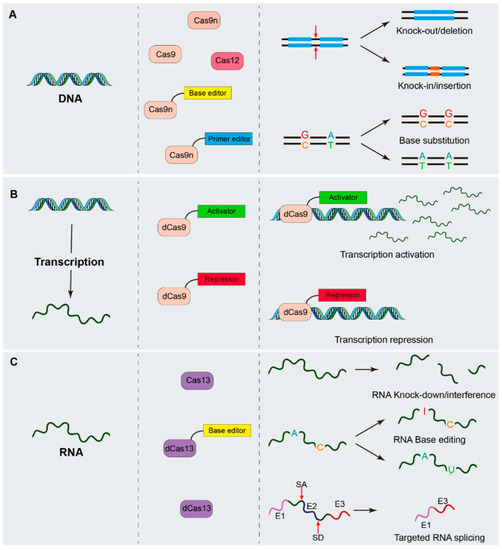 CRISPR/Cas systems mediated genetic manipulation. CRISPR-Cas systems allow multiple levels of genetic manipulation. (A) At the DNA level, Cas9, Cas9n and Cas12a are used for inducing dsDNA breaks for knock-out/deletion or knock-in/insertion. Cas9n can also be fused to base editors or primer editor to modify nucleotides in dsDNA for base substitution or base rewriting without introducing a dsDNA break. (B) During transcription, dCas9 can be fused to transcriptional activators, repressors, or epigenetic modifiers to activate or repress the transcription of single or multiple genes. (C) At the level of RNA, Cas13 can be used for targeted RNA manipulation. Cas13 can knock down specific RNA molecules by catalyzing RNA cleavage. Cas13 fused to base editors can be used to modify nucleotides in RNA molecules to achieve RNA base substitution or base rewriting. A single or multiple crRNA that bind to splice site motifs such as SA and SD combined with dCas13 protein can block specific exon from recognition by the splicing machinery, resulting in targeted RNA splicing. E1, exon 1; E2, exon 2; E3, exon 3; SA, splice acceptor site; SD, splice donor site.