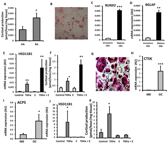 (A) Glucocorticoid activation by 11βHSD1 in ex vivo tibia explants freshly isolated after joint replacement surgery from patients with rheumatoid arthritis (RA, n = 8) and osteoarthritis (OA n = 9) determined by scanning thin-layer chromatography. (B) Alizarin red staining of osteoid nodules in primary human osteoblast (OBs) culture isolated from OA tibia. (C) RUNX2, (D) BGLAP and (E) HSD11B1 mRNA expression (AU) determined by RT qPCR and (F) glucocorticoid activation by 11βHSD1 in primary human osteoblast cultures isolated from OA tibia following treatments with either TNFα (10 ng/mL), cortisone (denoted E) (1000 nmol/L) or a combination of both for 24 h. (G), TRAP staining of multinucleated primary human osteoclast (OC) culture isolated from peripheral blood mononuclear cells. (H) CTSK and (I) ACP5 mRNA expression (AU) determined by RT qPCR in primary human macrophages (M0) and osteoclasts (OC) cultures isolated from peripheral blood mononuclear cells. (J) HSD11B1 expression (AU) determined by RT qPCR, and (K) glucocorticoid activation by 11βHSD1 in primary human osteoclast culture isolated from peripheral blood mononuclear cells following treatments with either TNFa (10 ng/mL), cortisone (1000 nmol/L) or a combination of both for 24 h. Values are expressed as mean ± standard error, n = 4 per group for primary culture. Statistical significance was determined using either two-way or one-way ANOVA with Tukey post hoc analysis. * p < 0.05, ** p < 0.01 and *** p < 0.001.