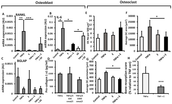 mRNA expression (AU) of (A) TNFSF11, (B) IL6 and (C) BGLAP determined by RT qPCR in primary human osteoblast culture isolated from OA tibia, following treatment with either TNFα (10 ng/mL), cortisone (denoted E) (1000 nmol/L), glycyrrhetinic acid (GE) (1 µM) or a combination of the above for 24 h. (D) Pro-collagen 1 synthesis by primary human osteoblast cultures isolated from OA tibia following treatment with either TNFα (10 ng/mL), cortisone (100 nmol/L), glycyrrhetinic acid (1 µM) or a combination of the above for 48 h. (E) Numbers, (F) average area and (G) average perimeter of primary human osteoclast cultures isolated from peripheral blood mononuclear cells determined in vitro by light microscopy and using Image J analysis per 500 µm2, following treatment with TNFα (10 ng/mL), cortisone (1000 nmol/L) or a combination of both for 72 h. (H) In vitro scoring of bone erosions on dentine chips following incubation with primary human osteoclasts (isolated from peripheral blood mononuclear cells) after 48 h determined by histological scoring following treatment with either TNFα (10 ng/mL), or a combination of TNFα and cortisone (100 nmol/L). Values are expressed as mean ± standard error, n = 4 per group for primary culture. Statistical significance was determined using either two-way or one-way ANOVA with Tukey post hoc analysis. * p < 0.05, ** p < 0.01 and *** p < 0.001.