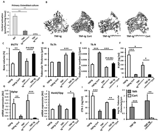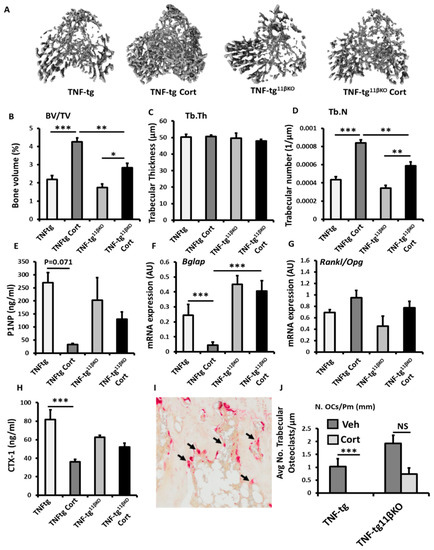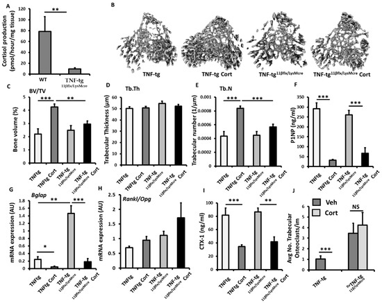 (A) Representative images of 3D reconstructions of tibia trabecular bone using micro-CT, (B) bone volume to tissue volume (BV/TV), (C) trabecular thickness (Tb.Th) and (D) trabecular number (Tb.N) determined by Meshlab software analysis of micro CT in TNF-tg and TNF-tg11βKO animals receiving either vehicle (Veh) or corticosterone (Cort) (100 µg/mL) in drinking water over 3 weeks. (E) Serum P1NP (ng/mL), mRNA expression (AU) of (F) Bglap mRNA expression (AU), (G) RankL/Opg mRNA ratio in trabecular bone and (H) serum CTX-1 (ng/mL) in TNF-tg and TNF-tg11βKO animals receiving either vehicle or corticosterone (100 µg/mL) in drinking water over 3 weeks and determined by ELISA and RT-qPCR. (I) Representative TRAP staining of trabecular osteoclasts on the corticoendosteal surfaces proximal of the epiphyseal growth plate in formalin fixed 5 µm sections, and (J) average number of osteoclasts normalised to trabecular bone perimeter (N. OCs/Pm (mm)) in TNF-tg and TNF-tg11βKO animals receiving either vehicle or corticosterone (100 µg/mL) in drinking water over 3 weeks determined using Image J analysis software following TRAP staining. Values are expressed as mean ± standard error of six animals per group. Statistical significance was determined using two-way ANOVA with a Tukey post hoc analysis. * p < 0.05, ** p < 0.005 and *** p < 0.001.