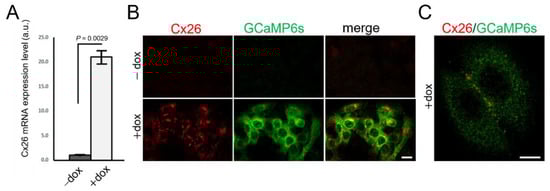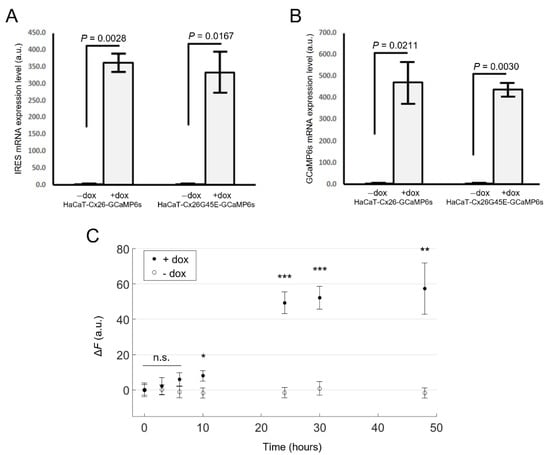 We inserted the Cx coding sequence (CDS) upstream of an internal ribosome entry site (IRES) sequence, in turn, followed by the CDS of GCaMP6s. Next, by puromycin selection of virally transduced cells, we obtained stable cell pools expressing human Cx26 (referred to as HaCaT-Cx26-GCaMP6s cells) or the lethal KID-related mutant Cx26G45E that generates leaky HCs [,,,,] (referred to as HaCaT-Cx26G45E-GCaMP6s cells). The expression levels of both IRES and GCaMP6s mRNAs increased over 350-fold within 24 h of doxycycline (dox) addition (2 µg/mL) to the culture medium (Figure 1). The non-zero levels of both mRNAs in the absence of dox can be attributed to the minimal basal leakiness of the TRE promoter in the lentiviral construct [].