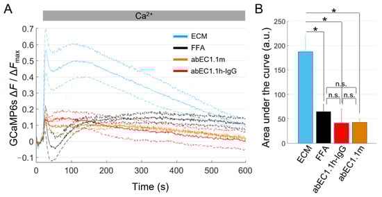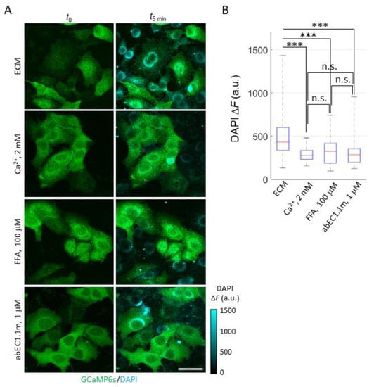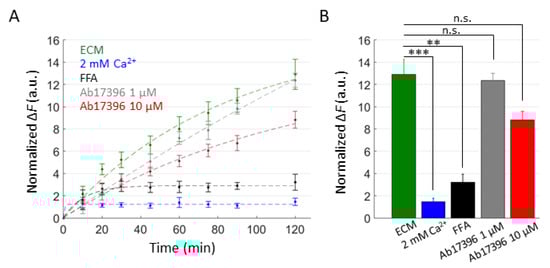For a complementary estimate of Ab17396 activity, we performed DAPI uptake experiments in ECM alone or supplemented with Ca2+ (2 mM), FFA (100 µM) and Ab17396 (1.0 or 10 µM) (Figure 7). DAPI uptake was significantly inhibited by both Ca2+ and FFA, whereas the reductions provided by Ab17396 were not statistically significant (P = 0.085 between ECM and 10 µM Ab17396 conditions). However, these results were negatively affected by the limited number of experimental replicates that we were able to collect due to the shortage of Ab17396.