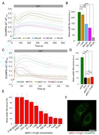 On the other hand, fluorometric assays based on intracellular Ca2+ variations are industry standards widely used in drug screening for membrane channels and G-protein coupled receptors (GPCRs) [,]. As shown here, the assay provided a sensitive indication for the effect of HC inhibitors, considering that it allowed us to detect changes in the uptake of Ca2+ with as little as 0.1 nM of the abEC1.1h-IgG mAb in HaCaT-Cx26-GCaMP6s cells.