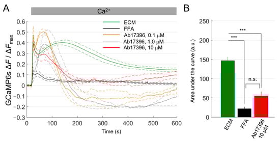FFA (100 µM) strongly reduced Ca2+ uptake in HaCaT-Cx46-GCaMP6s cells pre-exposed to dox for 24 h. In contrast, we observed a significant, clear-cut inhibitory effect of about 63% only with Ab17396 at 10 µM concentration. At two lower concentrations (0.1 and 1.0 µM), we could not estimate the [Ca2+]cyt load from the area subtended by the ΔF/ΔFmax traces because, surprisingly, the traces dropped below the pre-stimulus levels after CaCl2 bolus delivery (see Discussion).
