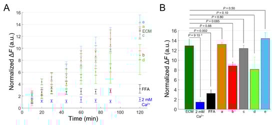 Finally, we quantified the [Ca2+]cyt load in terms of the area subtended by the ΔF/ΔFmax traces. The data analysis showed that the sensitivity of the assay plateaued between 1 mM and 2 mM final [Ca2+]ex (Figure 4B), therefore, we adopted 2 mM as the standard final [Ca2+]ex for all the other experiments. Reducing the initial [Ca2+]ex from 60 µM to 20 µM abolished the delayed and broader secondary maximum, resulting in a dramatically reduced assay sensitivity (Figure S2).