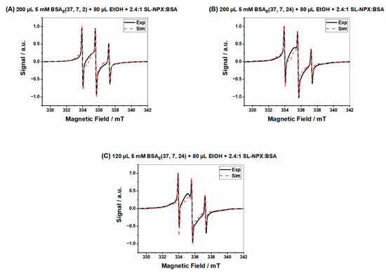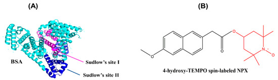 Two high-affinity drug binding sites have been proposed in human serum albumin (HSA), known as Sudlow site I and Sudlow site II. Sudlow site I is located in subdomain IIA and seems to preferentially bind to large heterocyclic and negatively charged compounds, while site II can bind small aromatic carboxylic acids [42,43]. It has previously been shown that HSA has two high-affinity binding sites for SL-NPX [34]. It must be mentioned that the crystal structure and binding characteristics of BSA demonstrate a high resemblance to HSA [43]; although, in the solution state, HSA seems to gain more flexibility than BSA [44,45,46]. We obtained precise data on the HSA binding affinities of various pharmaceuticals in solution by spin labeling and CW EPR spectroscopy, which provide information on protein-binding capabilities as well as the motional freedom of SL-drugs [34].