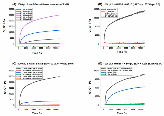 Time-dependent elastic (G′) and viscous moduli (G′′) of (A) 1000 µL 2.5 mM BSAE(37, 7) with different amounts of ethanol, (B) 1000 µL 2.5 mM BSAT(65, 7) and BSAP(37, 3.5), (C) 1000 µL 2.5 mM or 1.5 mM BSAE(37, 7) with 800 µL or 400 µL ethanol and (D) 1000 µL 2.5 mM BSAE(37, 7) with 540 µL ethanol in the presence and absence of SL-NPX. Total volume of each sample is 2000 µL, which is reached by adding appropriate amounts of water to the mixture of BSA, ethanol, and SL-NPX to reach the desired final volume.