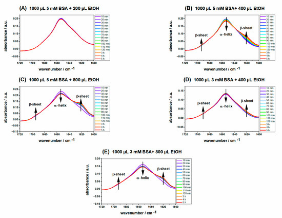 Time dependence of IR absorption spectra of 1000 µL (A) 5 mM BSA precursor solution with 200 µL ethanol, (B) 5 mM BSA precursor solution with 400 µL ethanol, (C) 5 mM BSA precursor solution with 800 µL ethanol, (D) 3 mM BSA precursor solution with 400 µL ethanol, and (E) 3 mM BSA precursor solution with 800 µL ethanol. All of the samples were measured at 37 °C on ATR IR crystal.