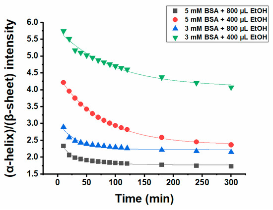 Figure 4 shows the intensity of (α-helix)/(β-sheet) during the gel formation process of 1000 µL 5 and 3 mM BSA with 400 µL and 800 µL ethanol, respectively, giving four samples altogether. Comparison of the hydrogels prepared with the same BSA concentration but a higher amount of ethanol (800 µL) with the one formed by the addition of a lower ethanol volume (400 µL) reveals that the (α-helix)/(β-sheet) ratio is much lower for the former, implying stronger conformational changes for the hydrogel with a higher ethanol concentration. Moreover, the ratio of (α-helix)/(β-sheet) for the hydrogels with the same amount of ethanol but different concentrations of BSA is higher when the hydrogel is formed by a lower BSA concentration. The results of ATR IR spectroscopy are in good agreement with the rheological measurements, as the value of the storage modulus for hydrogels prepared by higher BSA and ethanol concentrations is much higher compared to the ones made from low concentration of BSA and low ethanol content. This is an indication that there is a meaningful correlation between conformational changes, i.e., changes in the secondary structure content of the protein and its mechanical properties. In our previous work, we extensively studied the conformational changes of BSAT(65, 7) and BSAP(37, 3.5) alone and how the addition of 16-DSA affects the secondary structure of protein during gel formation [14].