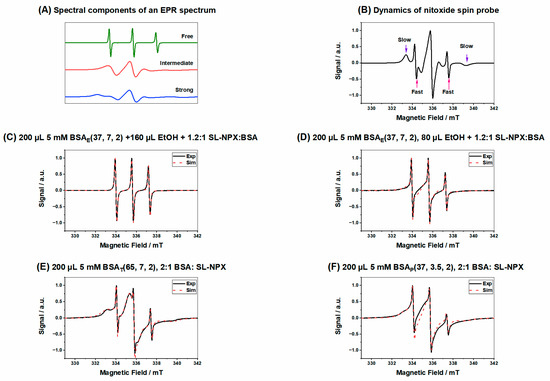 (A) Individual components of nitroxide radicals in EPR spectra, as derived from spectral simulation of different rotational motion, (B) features of the different components of an EPR spectrum for nitroxide spin probe, (C) SL-NPX-loaded BSAE(37, 7, 2) at a 1.2:1 SL-NPX:BSA molar ratio with 160 µL ethanol, (D) SL-NPX-loaded BSAE(37, 7, 2) at a 1.2:1 SL-NPX:BSA molar ratio with 80 µL ethanol, (E) SL-NPX-loaded BSAT(65, 7, 2) at a 2:1 SL-NPX:BSA molar ratio, and (F) SL-NPX-loaded BSAP(37, 3.5, 2) at a 2:1 SL-NPX:BSA molar ratio.