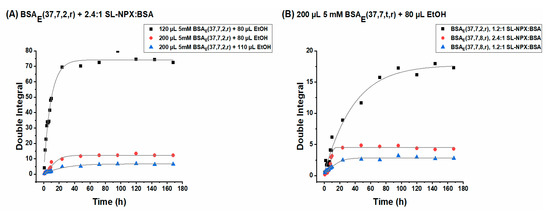 Following the drug release from different hydrogels allows evaluation of the effect of: (i) ethanol, BSA, and SL-NPX concentrations and (ii) incubation time on the sustained release behavior of SL-NPX. Figure 7 displays the SL-NPX release profile from BSA hydrogels achieved by plotting the double integral of the EPR spectra of the release medium against different time intervals.