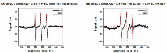 Figure 8A,B shows examples of EPR spectra gained by analyzing the release medium after 9 h and 168 h for ethanol-induced hydrogels prepared by the same amount of BSA (200 µL) and ethanol (110 µL) and SL-NPX:BSA molar ratio (2.4:1) and 2 h of incubation time.