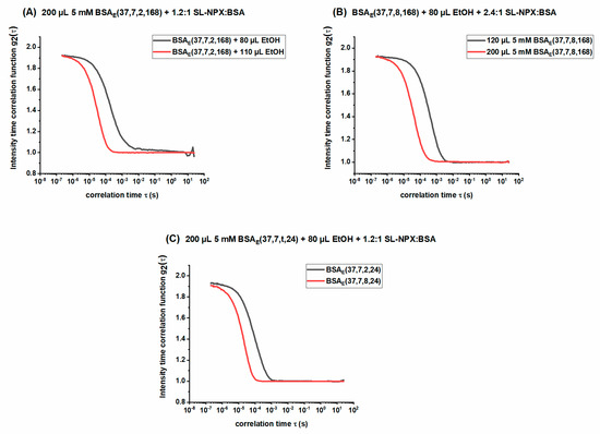 Intensity-time correlation functions for (A) SL-NPX-loaded BSAE(37, 7, 2, 168) at a 1.2:1 SL-NPX:BSA molar ratio prepared with different amounts of ethanol, (B) SL-NPX-loaded BSAE(37, 7, 8, 168) at a 2.4:1 SL-NPX:BSA molar ratio prepared with 80 µL ethanol and different BSA concentrations, and (C) SL-NPX-loaded BSAE(37, 7, t, 24) at a 1.2:1 SL-NPX:BSA molar ratio prepared with 80 µL ethanol.