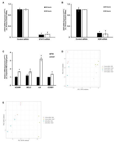 Verification of treatment conditions used in RNA-seq experiments. Sufficient knockdown of (A) STAT3 or (B) KDR mRNA was observed 24–36 h after transfection in cultured HRMECs (normalized mean ± SEM, * p < 0.05 vs. 24 h Control siRNA-transfected HRMECs, † p < 0.05 vs. 36 h control siRNA-transfected HRMECs, n = six per group from two independent experiments); VEGF-mediated gene expression changes of (C) VCAM1, BCL2, IL6, and CCND1 were observed after four hours of VEGF treatment compared to PBS, vehicle control, treatment in HRMECs (normalized mean ± SEM, * p < 0.05 vs. respective PBS, n = six per group from two independent experiments); PCA identified the grouping of transcriptomes from HRMECs treated with similar conditions in the (D) STAT3 RNA-seq dataset (n = three biologic replicates per group from the same independent experiment) and (E) KDR RNA-seq dataset (n = three biologic replicates per group from the same independent experiment).