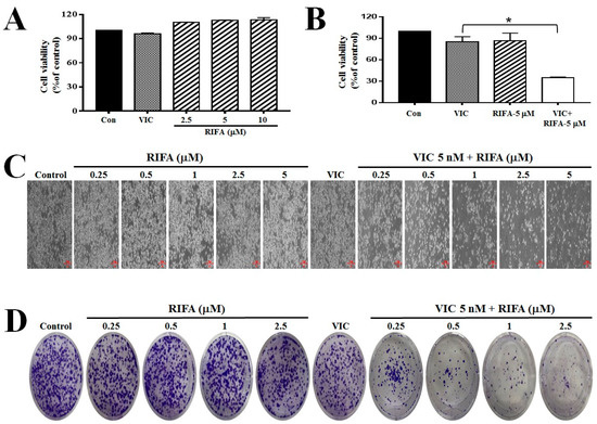 Rifabutin increases the cytotoxicity of VIC to P-gp-overexpressing drug-resistant KBV20C cancer cells. (A,B) KBV20C cells were treated with 5 nM VIC, indicated concentrations (μM) of rifabutin (RIFA), VIC + RIFA (5 μM), or 0.1% DMSO (CON) for 48 h. Cell viability assay was performed. Data are presented as mean ± SD. * p < 0.05 was considered be statistically significant. (C) KBV20C cells were treated with 5 nM VIC, the indicated concentration (μM) of rifabutin (RIFA) alone, or in combination with 5 nM VIC, or 0.1% DMSO (Control). After 1 day, all cells were observed using an inverted microscope at ×40 magnification. (D) KBV20C cells were treated for 3 days with 5 nM VIC, indicated concentration (μM) of rifabutin (RIFA) alone, or in combination with 5 nM VIC, or 0.1% DMSO (Control). Colony forming assays were immediately performed with crystal violet staining after a total of 10 days.