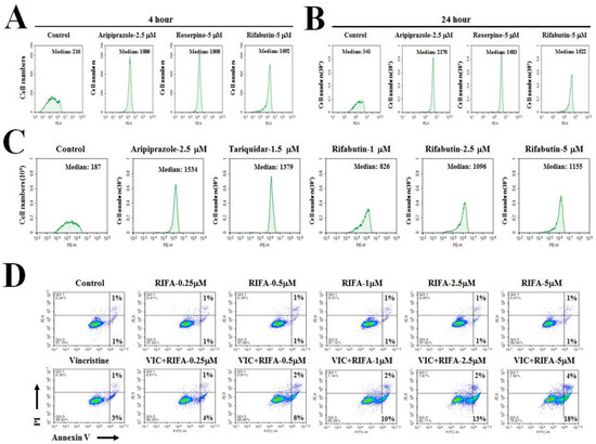 Rifabutin has high P-gp-inhibitory activity and increases early apoptosis in VIC-treated KBV20C cells. (A–C) KBV20C cells were treated with indicated concentrations of aripiprazole, reserpine, tariquidar, rifabutin (RIFA), or 0.1% DMSO (Control). After 4 h (A), 24 h (B), or 4 h (C) of rhodamine123 staining, all cells were examined using FACS analysis. (D) KBV20C cells were treated with 5 nM VIC, the indicated concentration (μM) of rifabutin (RIFA) alone, or in combination with 5 nM VIC, or 0.1% DMSO (Control). After 24 h, annexin V analyses were performed as described in Section 4: Materials and Methods.