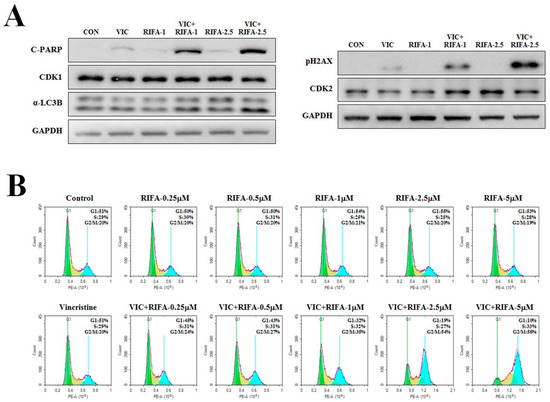 Rifabutin increases DNA damage and G2 arrest in VIC-treated KBV20C cells. (A) KBV20C cells were treated with 5 nM vincristine (VIC), 1 μM rifabutin (RIFA-1), 2.5 μM rifabutin (RIFA-2.5), 5 nM VIC with 1 μM rifabutin (VIC + RIFA-1), 5 nM VIC with 2.5 μM rifabutin (VIC + RIFA-2.5), or 0.1% DMSO (CON). After 24 h, Western blot analysis was performed using antibodies against C-PARP, CDK1, α-LC3B, pH2AX, CDK2, and GAPDH. (B) KBV20C cells were treated with 5 nM VIC, the indicated concentration (μM) of rifabutin (RIFA) alone, or in combination with 5 nM VIC, or 0.1% DMSO (Control). After 24 h, FACS analyses were performed as described in Section 4: Materials and Methods.