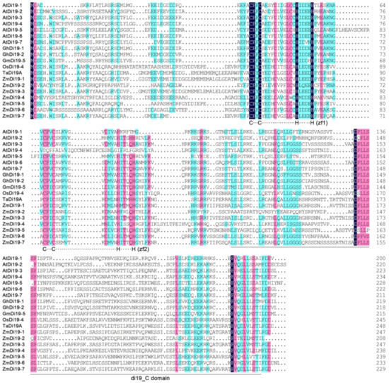 The HMM profiles of the zf-Di19 and Di19_C domains were used to search the Di19 family genes in maize using BLASTP program, and candidate sequences containing both of the two domains were considered to be a Di19 family gene. Finally, a total of seven non-redundant Di19 proteins were identified, and were randomly named as ZmDi19-1–ZmDi19-7. In addition, a total of 6 sorghum Di19 members (SbDi19-1–SbDi19-6) were downloaded from the phytozome database and subsequently used for phylogenetic analysis. The total number of ZmDi19 genes was the same with that in Arabidopsis and rice [16,18]. Sequence alignments indicated that all of the ZmDi19 sequences contained the two atypical Cys2/His2 zinc-finger motifs in the zf-Di19 domain. These results suggested that ZmDi19 genes are highly conserved in evolution, consistent with the observations of Di19 sequence characteristics in other species (Figure 1). The amino acid lengths of ZmDi19 proteins were ranged from 208–247 amino acids. The molecular weights and isoelectric points of ZmDi19 proteins ranged from 23.49 to 27.33 kDa and 4.55 to 6.67, respectively. The detailed information of ZmDi19 proteins was shown in Table S1.