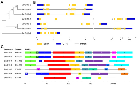 Phylogenetic tree, gene structure, and motif composition of ZmDi19 proteins. (A) Unrooted neighbor-joining phylogenetic tree of the ZmDi19 proteins. (B) Exon–intron structures of the ZmDi19 genes. Exons are shown as yellow boxes, introns are shown as black lines, and un-translated regions (UTRs) are shown as blue boxes. (C) Distribution of conserved motifs in the ZmDi19 proteins.
