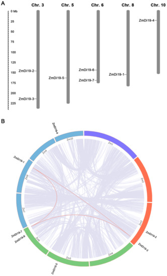 Chromosomal location and syntenic analysis of ZmDi19 genes. (A) Seven ZmDi19 genes located on the five of the 10 chromosomes. (B) Syntenic analysis among ZmDi19 genes.