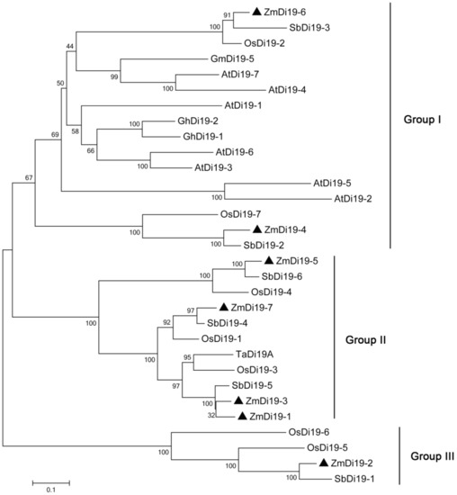 As mentioned above, Di19 proteins belong to C2H2 zinc-finger protein transcription factors [16,17,18]. The Pfam analysis indicated that each of the ZmDi19 proteins contain both of the zf-Di19 and Di19_C domains. Two atypical zinc-finger motifs, Cys-X2-Cys-X11-His-X4-His and Cys-X2-Cys-X10-His-X4-His, are especially highly conserved in the zf-Di19 domain. ZmDi19 proteins are similar in the distribution of protein motifs and gene structure. For example, each of the ZmDi19 genes contained five exons. These observations further confirmed the conserved evolution of Di19 gene family in plants. Based on phylogenetic analysis, the 31 Di19 proteins from maize, rice, sorghum, Arabidopsis, and other reported members were divided into three groups with high bootstrap values. We found the different evolutionary characteristics of Di19 gene family between dicot and monocot species. A total of six proteins from monocots were clustered in group I, and no monocot Di19 proteins were contained in groups II and III. It should be noted that some ZmDi19 members exhibited closely relationships with their orthologs in sorghum and rice, indicating that these genes might have been generated from a common ancestor, such as ZmDi19-4, OsDi19-7, and SbDi19-2 in group I, and ZmDi19-5, OsDi19-4, and SbDi19-6 in group II. To date, only a few Di19 genes have been reported in monocots, such as OsDi19-4, ZmDi19-1, and TaDi19A [18,24,34]. We found that ZmDi19-5 has a close phylogenetic relationship with OsDi19-4, and ZmDi19-7 shares a close phylogenetic relationship with TaDi19A.