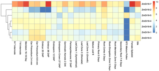 To investigate the tissue expression profiles of ZmDi19 genes, public RNA-seq data across different developmental stages was downloaded from the MaizeGDB database provided by [30], and heatmap analysis was performed based on the log2 (FPKM + 1) values. The RNA-seq data cover 23 developmental stages throughout the entire life cycle of maize. Results indicated that the ZmDi19 genes have differentially expression patterns across different developmental stages, and no members showed tissue-specific expression among the detected tissues (Figure 5). We noted that ZmDi19-7 was highly expressed in most of the developmental stages compared with other ZmDi19 genes, and all of the ZmDi19 genes have relatively low expression levels in mature pollen with the exception of ZmDi19-5. For the three genes involved in segmental duplication, ZmDi19-1 and ZmDi19-3 exhibited similar expression patterns, which might suggest their redundant functions during the plant growth and development.