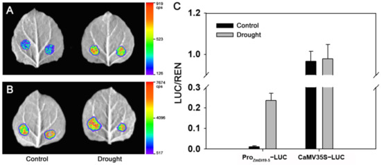LUC expressed activity of ZmDi19-5 promoter under control and drought conditions. (A) LUC expressed activity driven by ZmDi19-5 promoter; (B) LUC expressed activity driven by 35S promoter; (C) Quantitative analysis of LUC activity under control and drought conditions.