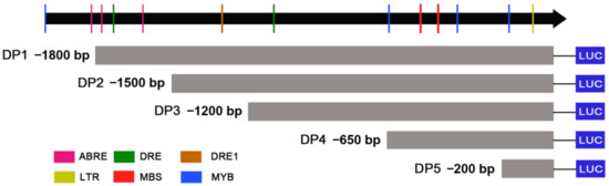 According to the CAEs distributions, five truncated fragments from 5′terminal were obtained using PCR amplification to identify the core region of the ZmDi19-5 promoter activity. The length of the five truncated fragments were: −1800 bp (DP1), −1500 bp (DP2), −1200 bp (DP3), −650 bp (DP4), and −200 bp (DP5), respectively (Figure 7). Each of the five truncated fragments was cloned into the pGreenII 0800-LUC vector to drive LUC expression. Then, the constructed vector harboring the truncated fragment and the full length (2000 bp) of the ZmDi19-5 promoter were transformed into tobacco with the same method of Agrobacterium-medicated transient transformation, respectively. The pGreenII 0800-LUC empty vector and constructed 35S:LUC vector were also transformed as the experimental controls, respectively. With the exceptions of DP5 construct and pGreenII 0800-LUC empty vector, significant LUC activity can be detected in each of the vector transformations (Figure 8A). According to the quantitative results, the detected LUC activity in the transformation of the DP4 construct was the strongest, and the LUC activity was dramatically decreased in the transformation of DP5 construct, suggesting that the 450 bp (−200 to −650) fragment was the core region required for the expressed activity of the ZmDi19-5 promoter (Figure 8B). Sequence analysis revealed that the 450 bp fragment contained 2 MBS and 2 MYB CAEs, which mays be related to drought response.