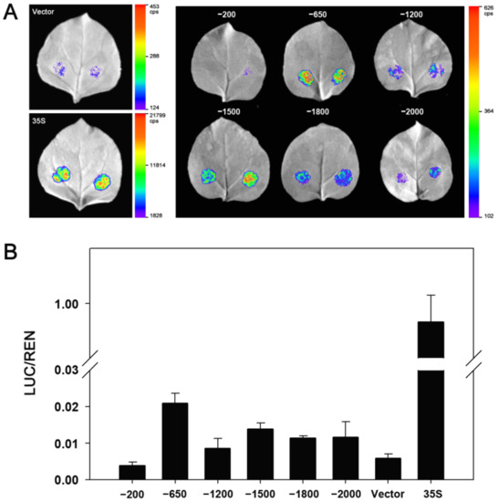 4.6. Determination of LUC Activity and Identification of Promoter Core Region