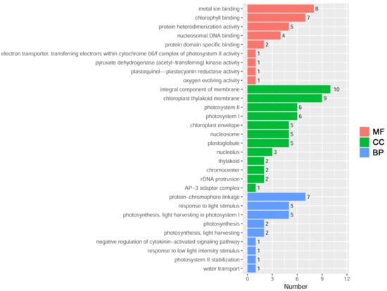 To identify the upstream regulatory proteins of ZmDi19-5, the 450 bp core region of the ZmDi19-5 promoter was cloned into a pAbAi vector to construct a pAbAi-ProZmDi19-5-450 vector, and transformed into yeast Y1HGold strain. Then, the 450 bp core region was used to screen the maize leaf cDNA library using the Y1H system. After the screening, a total of 28 sequences were obtained through yeast plasmid isolation and nucleotide sequencing (Table S4). To further explore the biological functions of the screened proteins, Gene Ontology (GO) enrichment analysis was performed for these protein sequences, and the results indicated that the 28 sequences were significantly assigned to 45 GO categories (p-value < 0.05), including 18 biological processes (BP), 14 cellular components (CC), and 13 molecular function (MF) terms (Figure 9). Most genes were assigned into GO terms of the integral component of the membrane (GO:0016021), chloroplast thylakoid membrane (GO:0009535), metal ion binding (GO:0046872), chlorophyll binding (GO:0016168), protein-chromophore linkage (GO:0018298), photosystem I (GO:0009522), photosystem II (GO:0009523), photosynthesis, light harvesting in photosystem I (GO:0009768), plastoglobule (GO:0010287), nucleosome (GO:0000786), response to light stimulus (GO:0009416), protein heterodimerization activity (GO:0046982), and chloroplast envelope (GO:0009941). We found that photosynthesis and light response-related terms were the main types among the 18 BP terms. In addition, one gene was assigned in the water transport (GO:0006833) and negative regulation of cytokinin-activated signaling pathway (GO:0080037) terms, respectively.