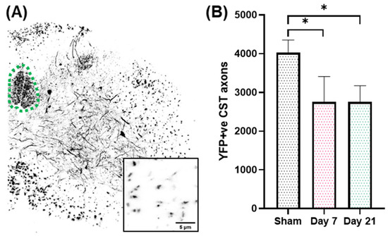 Injured and sham-injured mice were randomized to either the 7- or 21-day survival group. At each indicated survival time point, YFP-H mice were transcardially perfused with freshly depolymerized paraformaldehyde in PBS (4% in 0.1 m PBS, pH 7.4), dissected and postfixed overnight in the same fixative. Blocks containing the lower cervical spinal cord were cryoprotected (20% glycerol, 5% DMSO) and 50 μm sections at the level of C6-C7 were cut using a freezing microtome. Sections were mounted on slides, air dried and coverslipped with Vectashield ((Vector Laboratories Inc., Newark, CA, US). Sections from YFP-H mice were imaged on a Zeiss LSM 880 Confocal with Airyscan FAST Module (RRID:SCR_015963, Carl Zeiss Microscopy, LLC, White Plains, NY, US). In this case, 15 μm z-stacks covering the CST were taken at 63× objective with Airyscan FAST, deconvoluted and stitched with ZEN Black software (RRID:SCR_018163, Carl Zeiss Microscopy, LLC, White Plains, NY, US)). Images were binerised using adaptive 3D thresholding (plugin developed by Christian Henden) on FIJI (RRID:SCR_002285) [37] and individual axons were analyzed for Feret’s diameter (Supplementary Figure S2).