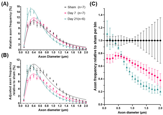 Axonal diameter distribution changes in the corticospinal tract after impact-acceleration traumatic brain injury. (A) Relative frequency plots of axon calibers (Feret’s diameter) at 7 or 21 days after injury or sham injury, fitted with lognormal curves. (B) Adjusted frequencies relative to the sham injury group (area under the curve represents total axon survival). (C) Estimated relative axon frequency per axon diameter bin, compared to sham-injured animals. Error bars represent standard error of the mean for each group.