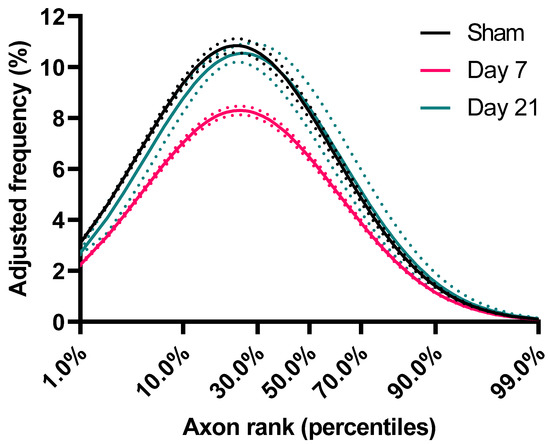 In order to assess the ADD, Feret’s diameters of axons were analyzed for each case within each experimental group by relative frequency histograms, with a bin size of 0.1μm, with Prism 9 (RRID:SCR_002798, GraphPad Software, San Diego, CA, USA). Relative frequencies per bin per case were used for fitting longnormal models for each group and for plotting average frequencies and standard error of the mean (SEM) per bin per group. For each case and each group, we estimate shape features of the ADD that may discriminate between the groups (e.g., geometric mean, geometric standard deviation) and their variance of the estimates were computed by the leave-one (mouse) Jackknife re-sampling algorithm [39]. Statistical differences between groups were assessed by ANOVA and t-test post hoc comparisons. p Values were calculated using the permutation distribution of the F-statistic and t-statistic [40], in order to retain validity with sample sizes under consideration. For estimation of axon changes with adjustment for axon losses and relative to the sham group, adjusted relative frequencies were calculated as the product of relative frequencies for each bin with the mean axon survival per group. In this case calculated standard errors account for the original variance in the relative frequencies but not for the variance in axonal survival within each group.