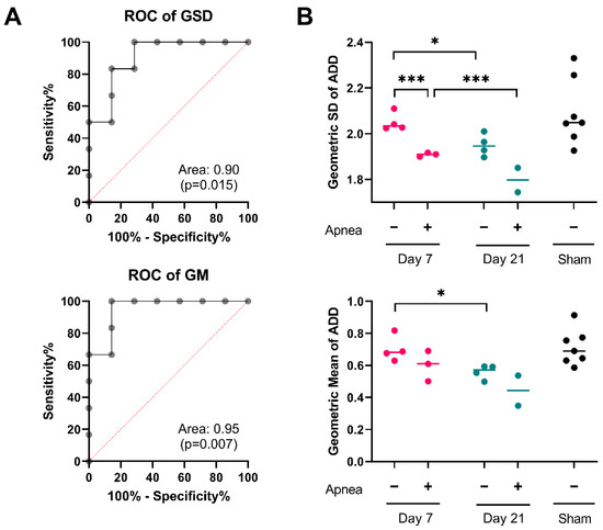 ADD signatures in individual mice. (A) Receiver operating characteristic curves for geometric standard deviation (GSD) and geometric mean (GM) of ADDs at 21 days post injury. (B) Changes in the GSD and GM of ADDs in individual mice after injury. Two-way ANOVA for the effects and interactions between post-injury apnea and survival after injury on the GSD of the ADD revealed significant contribution of both post-injury apnea, F1,9 = 32.86; p < 0.001; and post-injury interval, F1,9 = 13.45, p = 0.004. Mice that experience apnea showed evidence of a lower GSD of the ADD at day 7, t = 3.11, p < 0.001; but not at day 21 t = 3.11, p = 0.066. There was significant reduction in the GSD from day 7 to day 21 for both the apnea group, t = 2.76, p < 0.001, and the no apnea group, t = 3.19, p = 0.028. Similarly, the two-way ANOVA for the effects and interactions between post-injury apnea and survival after injury on the GM of the ADD revealed significant contribution of both post injury apnea, F1,9 = 5.27; p = 0.044; and post-injury interval, F1,9 = 9.10, p = 0.009. Mice that experience apnea did not show evidence of a different GM of the ADD at day 7, t = 1.54, p = 0.171 or at day 21 t = 1.75, p = 0.139. There was significant reduction in the GM from day 7 to day 21 for the no apnea group, t = 3.106, p = 0.029, but not in the apnea group, t = 1.59, p = 0.206. *, p < 0.05; ***, p < 0.001.