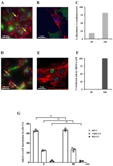 Expression and localization of MRTFA-GFP fusion protein on neonatal rat cardiomyocytes. Cells were infected by adenovirus MRTFA-GFP at 50 MOI and starved in serum free DMEM medium for 24 h. Serum stimulation was performed by adding 20% serum (13.5% HS plus 6.5% FCS) to medium during 60 min in (A–F). (A,B) Immunofluorescence labeling of vimentin (red), and MRTFA-GFP (green). The yellow arrows indicate fibroblasts. (C,D) Immunofluorescence labeling of desmin (red), The orange arrows indicate cardiomyocytes including MRTFA-GFP localized in the nucleus (green). (E) Histogram representing percentage of cardiomyocytes (CM) and fibroblasts (FB) in cultured cells. (F) Histogram of percentage of CM and FB having MRTFA-GFP protein. (G) Percentage of three categories of MRTFA-GFP distribution in NRCs under basal conditions (serum free) at the beginning (0 min) and the end (60 min) of experiment. ns: non-significant. These data are representative of 3 independent experiments, n = X − Y (range) cells per analysis.