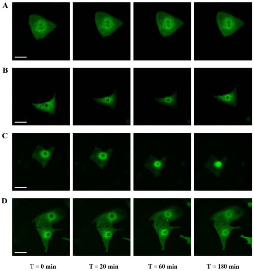 These cells are also responsive to pro-hypertrophic agonists such as phenylephrine (PE), an adrenaline analog that stimulates α-adrenergic receptors, or endothelin-1 (ET-1) and angiotensin II (Ang II) that are peptide hormones triggering cardiomyocyte hypertrophy [,,]. We treated NRCs with ET-1, PE or Ang II at different time points ranging from 5 min to 3 h to determine the kinetics of MRTFA-GFP nuclear translocation. Before the addition of agonists, cells were cultured in a serum-deprived medium for 24 h. Whatever the agonist used, the maximum MRTFA-GFP translocation was obtained between 40 and 60 min after addition of the hormones and continued gently until 3 h to reach more than 63%, 74% or 84% of nuclear MRTFA-GFP with ET-1, Ang II or PE, respectively (Figure 2C–E and Figure 3C, Videos S2 and S3).