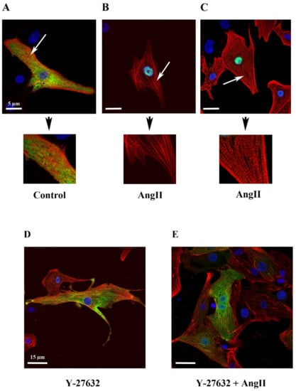 Impact of ROCK inhibitor (Y-27632) on actin network in relation to MRTFA-GFP shuttle. NRCs were infected either by adenovirus MRTFA-GFP alone at 50 MOI or by both adenovirus MRTFA-GFP and Life-Act-RFP. Cells were starved in serum-deprived DMEM medium for 24 h before the treatment. The immunofluorescent staining of α-cardiac actin (red) and fluorescent image of MRTFA-GFP (green), (A) basal conditions (serum free); (B) treatment with Ang II (100 nM). (C) The fluorescent image of MRTFA-GFP (green) and Life-Ac-RFP (red) with Ang II (100 nM) treatment. The white arrows indicate F-actin at 180 min. The immunofluorescent staining of α-cardiac actin (red) and fluorescent image of MRTFA-GFP (green), (D) treatment with Y-27632 (10 µM); (E) treatment with Ang II (100 nM) + Y-27632 (10 µM). Scale bar: 5 or 15 µm.
