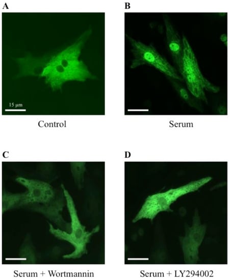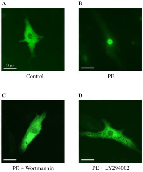 To establish a potential involvement of the PI3K signaling pathway on the MRTFA shuttle in cardiomyocytes, we used wortmannin and LY294002, two distinct inhibitors of PI3K. Wortmannin acts by an irreversible inactivation of PI3K by covalent modification of the catalytic subunit [,], while LY294002 reversibly inhibits PI3K by competing with ATP for the active site of catalytic subunit p110 [,]. Similar to the results shown in Figure 2, more than 70% of MRTFA-GFP is localized in the nucleus 60 min after serum induction (Figure 5B) compared with the basal conditions where more than 95% of MRTFA-GFP is detectable in the cytoplasm (Figure 5A). Cardiac cells were placed in a serum-deprived medium for 24 h then treated for 30 min with wortmannin or LY 294002 before the addition of the serum. A similar distribution profile of MRTFA-GFP in the cytoplasm of the cardiomyocytes treated with the inhibitors alone was observed as that observed in Figure 5A (data not shown). We observed a blockage of MRTFA-GFP in the cytoplasm area 60 min after the addition of the serum (Figure 5C,D). In addition, we tested the effects of a pro-hypertrophic agonist (PE) in the conditions of PI3K inhibition. The experiment was carried out under the same conditions as the serum, just with it replaced by PE. After 180 min of PE stimulation, we confirmed the nuclear translocation of MRTFA-GFP compared with the basal conditions (Figure 6, compare A to B). The addition of wortmannin or LY294002 leads to a blockage of MRTFA-GFP in the cytosol despite the presence of PE (Figure 6C,D). These data show that the PI3K signaling pathway is involved in the MRTFA shuttling process.