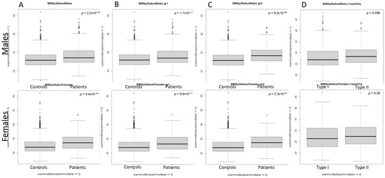 Figure 1 presents the evidence for a greater predisposition of psoriatic patients to overweight and obesity than control donors. In general, psoriatic patients had statistically significant higher BMI values than the control group (p = 2.2 × 10−16 for males and p = 3.4 × 10−16 for females). There were statistically significant differences between type I and type II male psoriasis patients (p = 0.036); however, the discrepancies in BMI values were insignificant for female psoriatic patients (p = 0.26).
