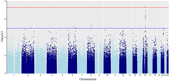 The “Manhattan” plot for GWAS interaction analysis of the BMI and psoriasis types association. Chromosomes are represented on the x-axis (black and grey dots). The −log10 (Joint.pval) is represented on the y-axis. Blue line indicates a suggestive association threshold (Joint.pval = 1 × 10−5). Red line indicates the genome-wide significant threshold (Joint.pval = 5 × 10−8).