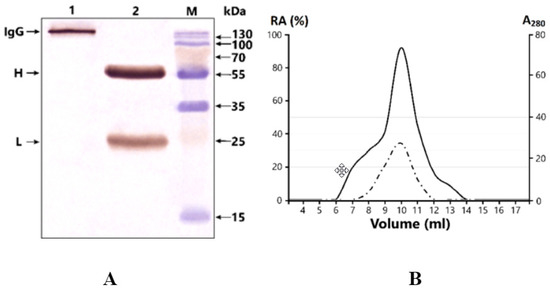 (A) SDS-PAGE analysis of homogeneity IgG in 12.5% gel followed by silver staining. Lane 1—intact IgG; lane 2—IgG incubated with 40 mM DTT at 100 °C (conditions for the complete reduction of disulfide bonds); lane M—protein molecular weight markers. (B) FPLC gel filtration on Superdex200 column of IgGmix in an acidic buffer (100 mM Gly-HCl, pH 2.6) after IgG preincubation in the same buffer. Absorbance at 280 nm (A280); the relative activity (%) of the obtained fractions in the hydrolysis MBP.