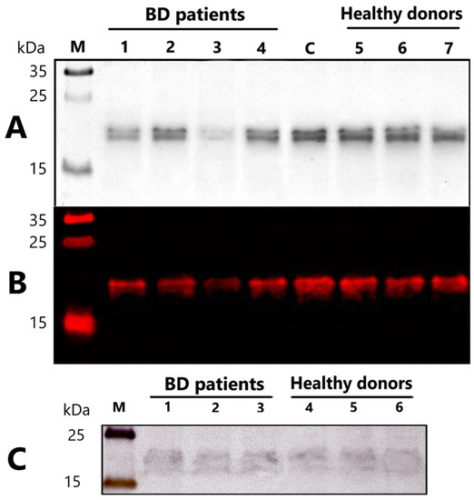 The standard reaction mixture after incubation with IgG of BD patients or healthy individuals was separated on SDS-PAGE, as described above in Section 4.4 and transferred to polyvinylidene difluoride (PVDF) membranes using electroblotting in tris glycine transfer buffer. The blot was pre-incubated for 1 h in a blocking buffer (5% BSA in phosphate-buffered saline (PBS)), then in primary anti-myelin basic protein (MBP) antibodies overnight at 4 °C at concentrations of 1:2000 (Aves Labs, Davis, CA, USA). The blot was washed with PBS containing 0.05% Tween (Sigma Aldrich, Saint Louis, MO, USA) (3 × 10 min), and incubated for 1 h with the secondary antibody conjugated with Alexa Flour 594 (1:2000, Jackson ImmunoResearch, West Grove, PA, USA). The blot was washed again in PBS-Tween (3 × 10 min) and the bands were visualized using the iBright Imaging Systems FL1500 (Thermo Scientific, Waltham, MA, USA).