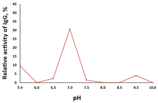 Analysis of the pH-dependence of the MBP-hydrolyzing activity was performed for the total IgGmix of five patients with high and medium activity (Figure 4). In our study, analysis of MBP-hydrolyzing activity of IgGs of BD patients was carried out within a wide range of pH values 5.4–10.0, considering MBP stability in the pH range of 4–10.5 [44]. Catalytic IgGs of BD patients are able to efficiently hydrolyze MBP within a wide range of pH values 5.4–9.5, with a pronounced optimum of MBP hydrolysis at pH 7.0. Additionally, less pronounced peaks of proteolytic activity were registered at pH 5.5 and pH 9.5.