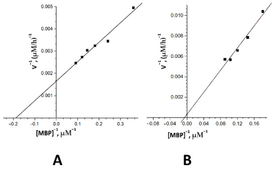 Determination of the kinetics parameters of MBP hydrolysis using the Lineweaver–Burk plot in the case of two individual IgG-1 (A) and IgG-2 (B) preparations of two patients with bipolar disorder.