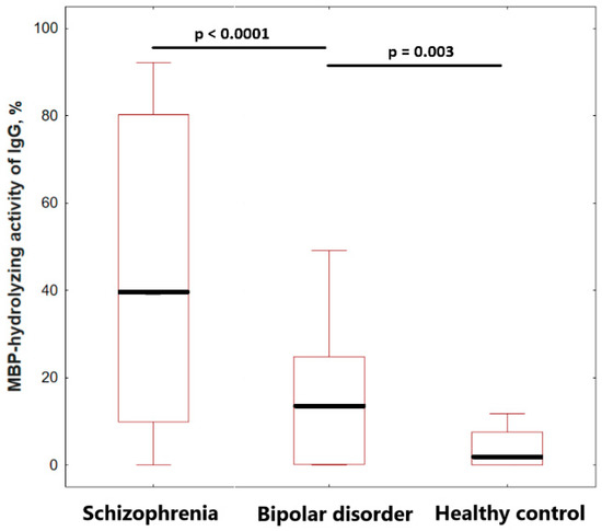 The MBP-hydrolyzing activity of IgGs from the sera of patients with bipolar disorder, schizophrenia and healthy peoples. The level of MBP-hydrolyzing activity of IgGs was normalized to standard conditions (1 mg/mL MBP proteins; 0.2 mg/mL IgGs; 20 h of incubation at 37 °C). The complete hydrolysis of the MBP as substrate is taken as 100%. The significance of the differences (p) is calculated by the Mann–Whitney U test.
