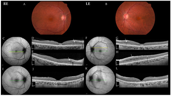 Color fundus photos and progression of DRAM2 retinopathy in Patient 1. (A,B) Color fundus photos at the age of 35 years; (C,F) fundus autofluorescence imaging (FAF) and (D,G) optical coherence tomography (OCT) images at the age of 35 years; (E,H) more peripheral OCT images at the age of 35 years; (I,K) FAF and (J,L) OCT images at the age of 37 years. Green lines in the FAF images show the location of the corresponding OCT scans in images (D,G,J,L). Yellow lines on the FAF images show the location of the corresponding OCT scans in images (E,H). Note the intraretinal cysts in images (D,E,G,H) (white arrows). On follow-up, the disappearance of the foveal photoreceptors (J,L) on and widening of the hypoautofluorescence in the fovea (I,K) is seen. Abbreviations: RE—right eye; LE—left eye.