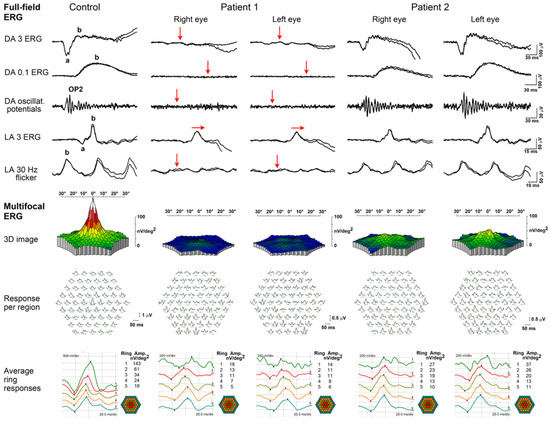 Full-field ERG and multifocal ERG findings in Patient 1 (last visit) and Patient 2 (first and only visit) compared with an age-matched control subject. Abbreviations: DA—dark-adapted; LA—light-adapted; Amp—amplitude; a—a-wave, negative ERG component that arises mostly from photoreceptoral activity; b—b-wave, a positive ERG component originating mostly from bipolar cells; OP2—oscillatory potential, second wave. Arrows indicate reduced (vertical arrow) and delayed (horizontal arrow) full-field ERG responses in Patient 1. Note the reduced mfERG responses in Patient 1 over the whole macular region. The mfERG responses in Patient 2 were reduced, especially in the inner two rings.