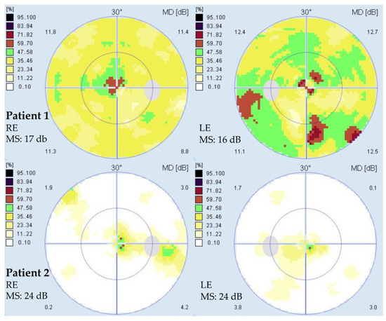 Visual field (Octopus G2 top) of Patient 1 (upper row) and Patient 2 (bottom row) at the last visit at the ages 37 and 63 years, respectively. Note the reduced central sensitivity in both patients, more pronounced in Patient 1. A color-coded sensitivity scale is shown on the left. Abbreviations: RE—right eye; LE—left eye; MS—mean sensitivity.