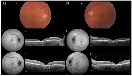 Color fundus photos and progression of DRAM2 retinopathy in Patient 2. (A,B) Color fundus photos at the age of 63 years; (C,E) fundus autofluorescence (FAF) and (D,F) optical coherence tomography (OCT) images at the age of 61 years; (G,H) fundus autofluorescence and (I,J) and OCT images at the age of 63 years. Green lines in the FAF images show the location of the corresponding OCT scans. Note a minimal darkening of the foveal hypoautofluorescence corresponding to the increased signal passing through the choroid on the OCT, reflecting retinal pigment epithelium atrophy. Abbreviations: RE—right eye; LE—left eye.