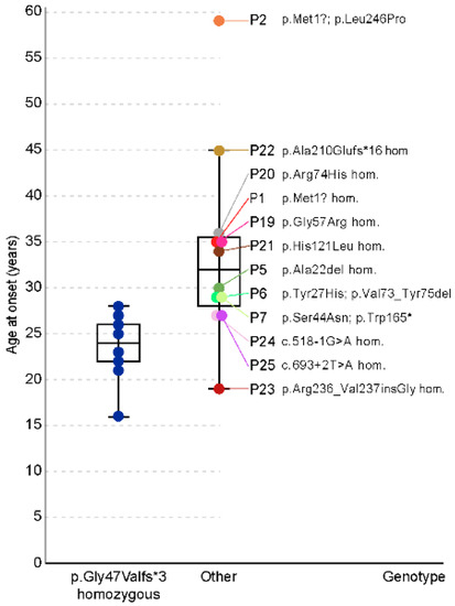 Disease onset in patients harboring homozygous variant p.Gly47Valfs*3 (baseline group) compared with the other patients. Note the significantly earlier median age of onset in the baseline group. Other patients had very variable disease onsets i.e., Patient 2 (p.Met1?; p.Leu246Pro) at the age of 59 years, Patient 22 (p.Ala210Gluufs*16 homozygous) at the age of 45 years and Patient 23 (p.Arg236_Val237insGly homozygous) at the age of 19 years. Note that all patients with pathogenic variant p.Gly47Valfs*3 are in the blue color. The colors of the patients are the same in Figure 5, Figure 6, Figure 7 and Figure 8.